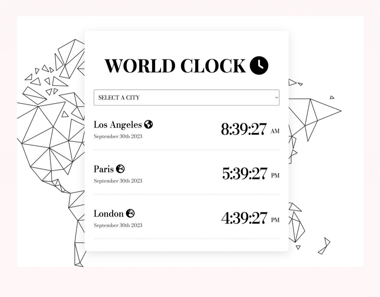 I've designed a world clock that displays the time across various locations situated in different time zones. This functionality is achieved through the utilization of JavaScript Timing Events, Date formatting techniques, and HTML input types.